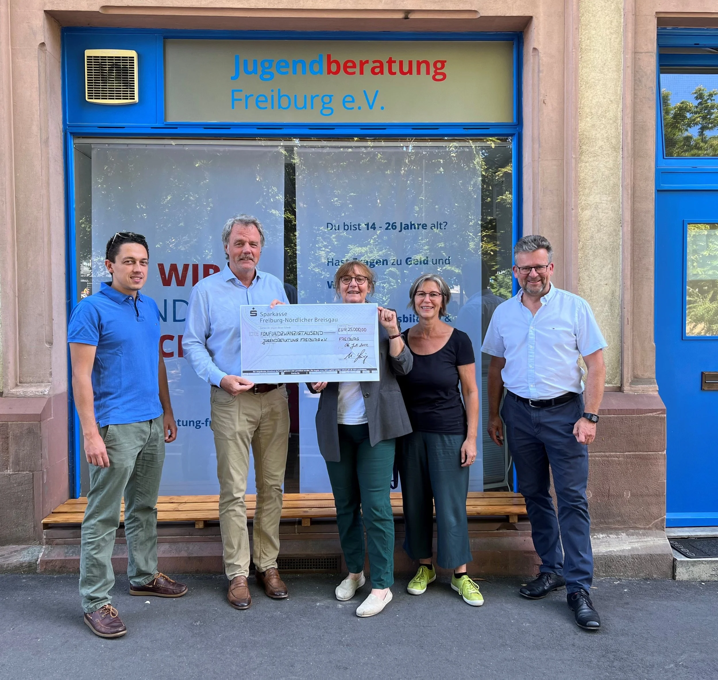 Die feierliche Scheckübergabe vor dem neu gestalteten Schaufenster der Jugendberatung.